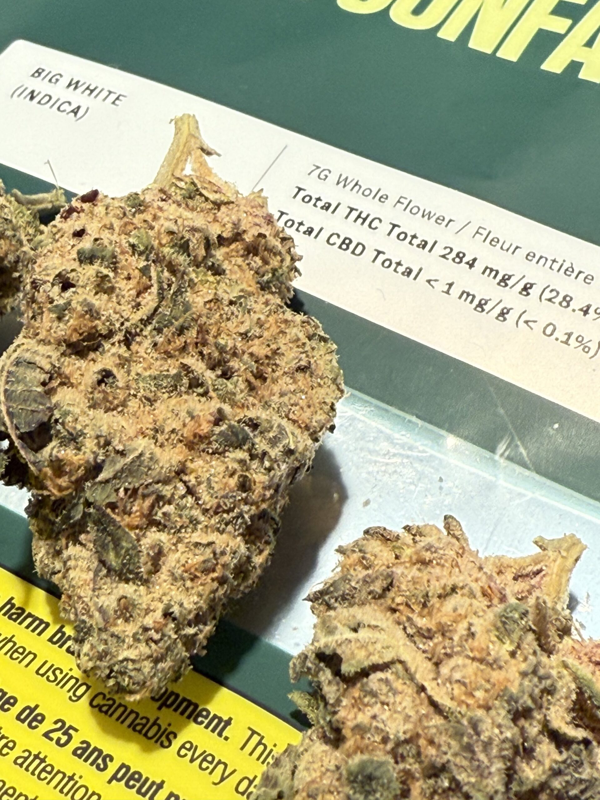 Big White is an indica-dominant hybrid that combines The White with Big Bud genetics. Bred by La Plata Labs, this strain began as an F1 hybrid created by Eclectic Genetics. La Plata Labs then refined and stabilized the genetics through generations of breeding and phenotype selection. This strain is known to produce large yields of sweet, sugary buds that express themselves in a variety of colors and carry a unique maple syrup flavor.There is another known hybrid by the name of Big White. It is bred by Breeder’s Choice and its lineage is a combination of Power Plant and Chronic genetics.