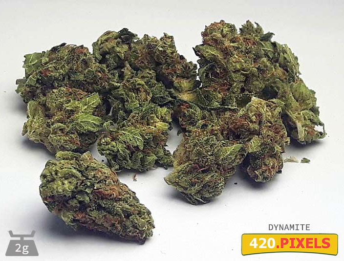 Dynamite is a short and bushy indica strain that offers an aroma of sweet grapefruit and mixed fruit. Heavy physical effects weigh down the limbs and relax muscles, but Dynamite provides the mind with an invigorating spark to fuel creativity and conversation. The subtle, sweet aroma of grapefruit and mixed fruit breaks free from the bud when ground up. A quick finisher, Dynamite completes its flowering cycle in 7 to 8 weeks, yielding a heavy harvest of buds that may bloom in stunning hues of purple and pink.