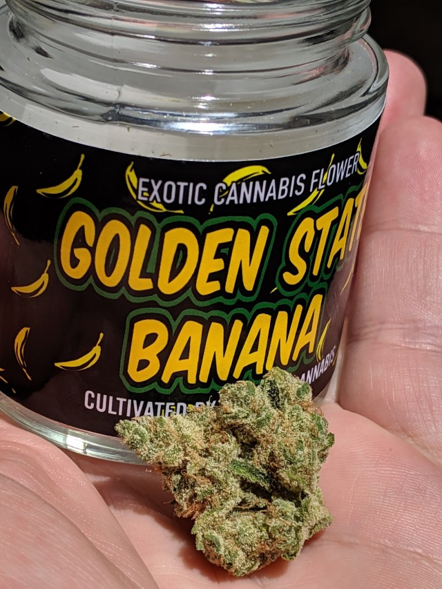 Golden State Banana is a fruity indica cross of Ghost OG and Banana Kush. This semi-sedative strain fills the consumer’s mind with euphoria while wrapping the limbs in a warm, relaxing sensation. The aroma is a mixture of Ghost OG’s pungent, citrus terpenes and Banana Kush’s tropical scents, creating a rich bouquet with bright floral sweetness. Uplifting and relaxing, Golden State Banana’s effects are ideal for unwinding at the end of the day while elevating mood and frontloading creativity.