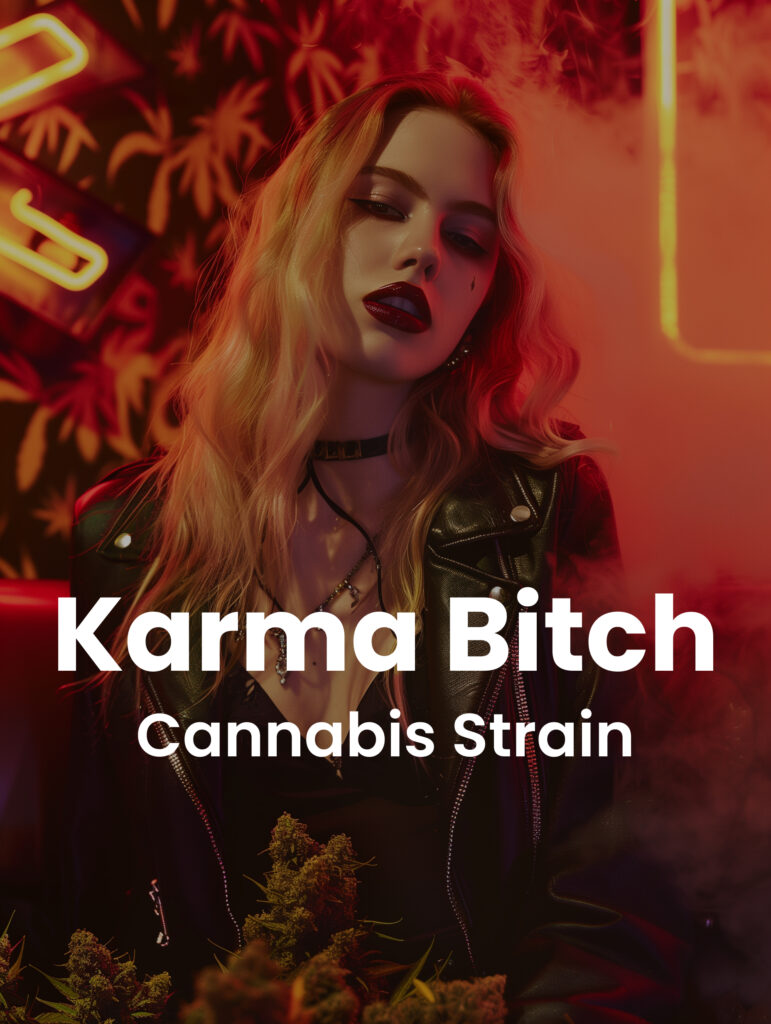 Karma Bitch is a 50/50 hybrid cannabis strain bred by Rare Dankness using parent strains Skywalker OG and Nevil’s Wreck. It produces a well-balanced cerebral sensation with lingering notes of chocolate and coffee. Once the pistils turn a fiery orange color around 9-10 weeks, the resinous flowers will be ready for harvest.