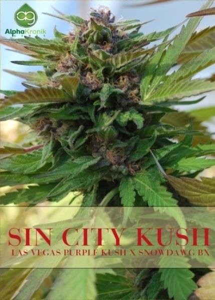 Sin City Kush is an 80/20 indica-dominant cross of LVPK and Snowdawg bred by Alphakronik Genes Seeds. The buds of Sin City Kush are a mix of deep purple and green hues with a glossy coat of white trichomes and a compelling floral aroma. Don’t expect to accomplish much when trying Sin City Kush — the indica influence weighs heavy on the body and mind, so this strain is best enjoyed after your daily tasks are complete.