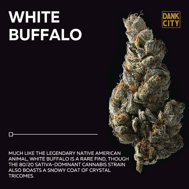 White Buffalo is an 80/20 sativa-dominant cannabis strain that descends from a Romulan and a Blackberry Kush/Bay 11 hybrid. Like the sacred animal of Native American tradition, this White Buffalo is a cherished rarity that may only seldom migrate to your stash jar. Sweetly sour in flavor and covered in a snowy coat of crystal trichomes, White Buffalo provides a powerful blast of euphoria that may surprise any consumer expecting an active and uplifting sativa experience.